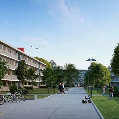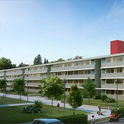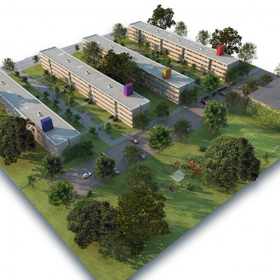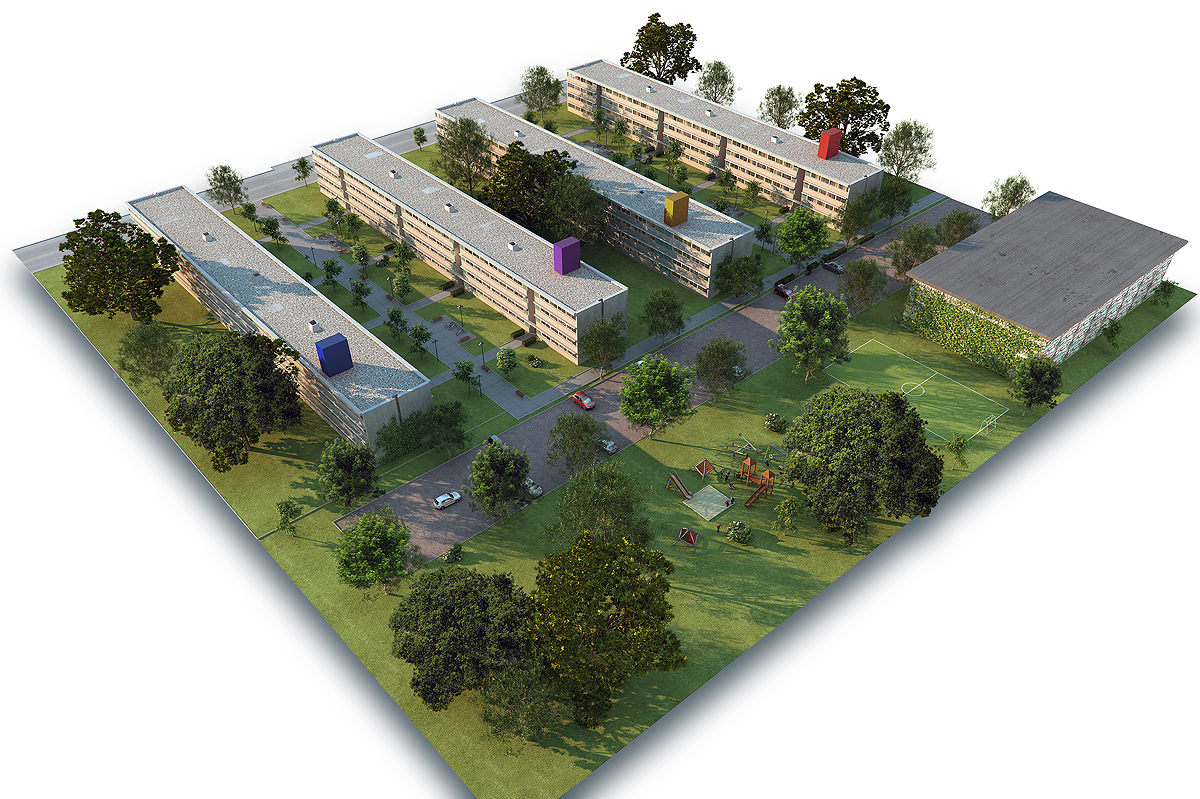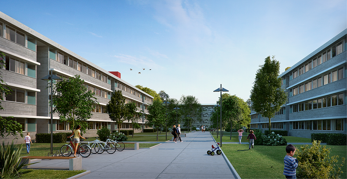 Programa: viviendas de interés social, 256 unidades de vivienda, canchas deportivas y salón de usos múltiples.